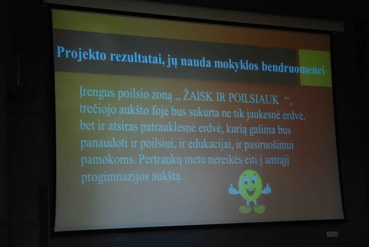 Džiaugiamės, kad mokiniai aktyviai dalyvavo šiuose projekto įgyvendinimo etapuose ir nekantraujame įgyvendinti daugiausiai mokinių balsų surinkusią 1a klasės mokinių idėją „Poilsio Prieglobstis“. Iniciatyva bus įgyvendinta iš Savivaldybės biudžeto lėšų.