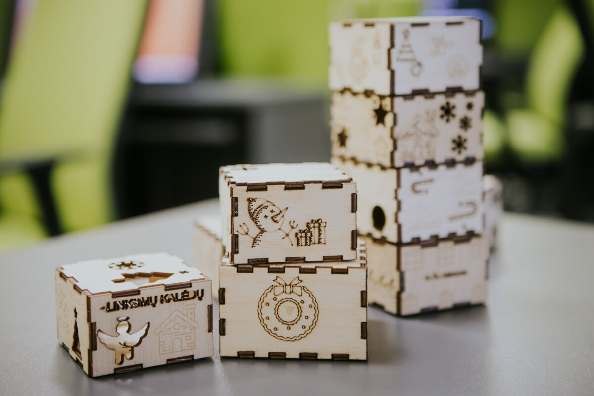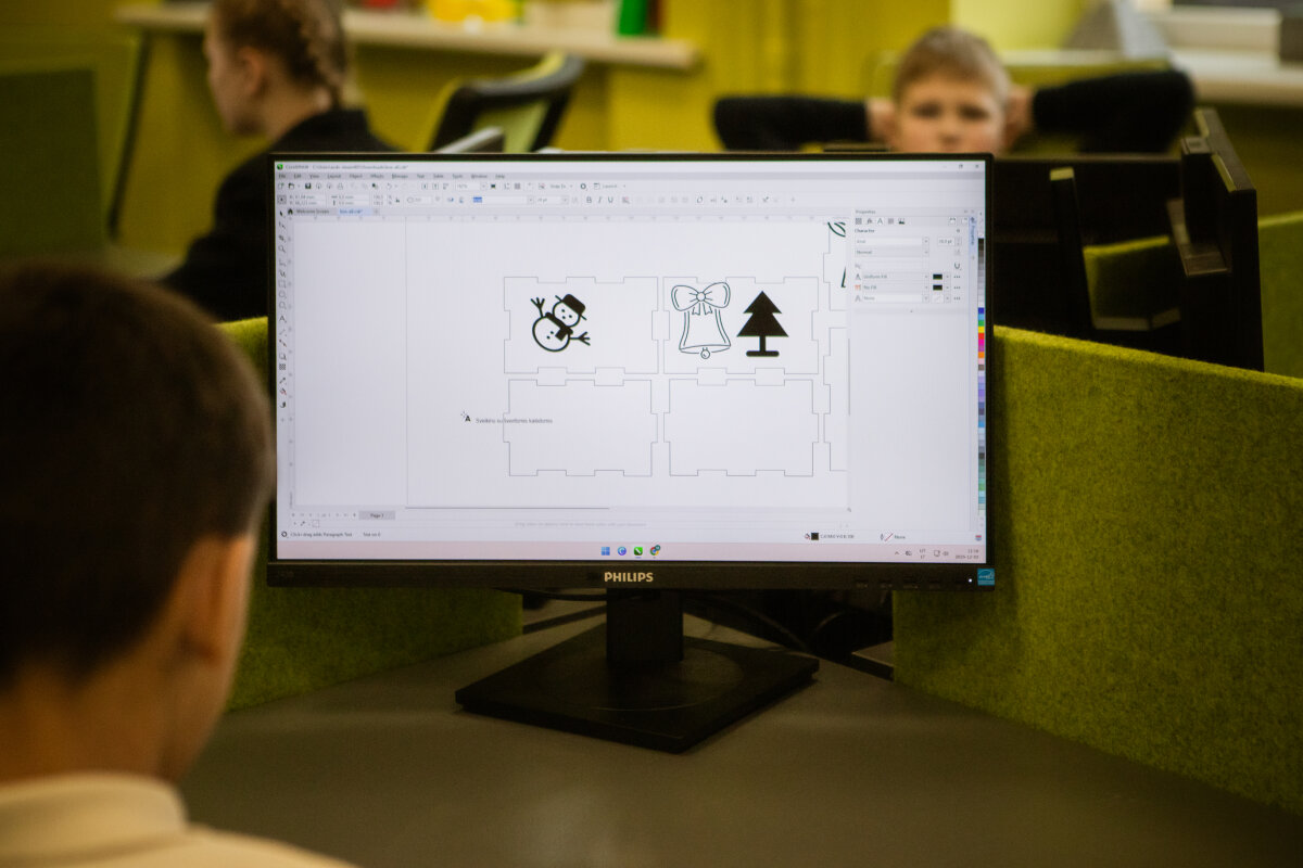 Pirmojoje užsiėmimo dalyje mokiniai projektavo magiškas kalėdines dėžutes, naudodami profesionalią CorelDRAW programą. Penktokai puikiai susitvarkė su šiuo iššūkiu – kūrė tikslius brėžinius, planavo dėžučių formas ir dekorus. Vėliau jų suprojektuoti darbai buvo išpjauti iš plokštės lazerinėmis staklėmis. Prieš prasidedant pjovimo procesui, dėstytojai mokiniams pristatė, kaip veikia lazeris, kokie yra jo saugumo reikalavimai ir kaip iš kompiuterinio brėžinio sukuriamas realus gaminys. Mokiniai taip pat patys prisidėjo prie lazerio staklių paruošimo pjovimui, o tai suteikė dar daugiau praktinės patirties ir supratimo apie modernias technologijas.