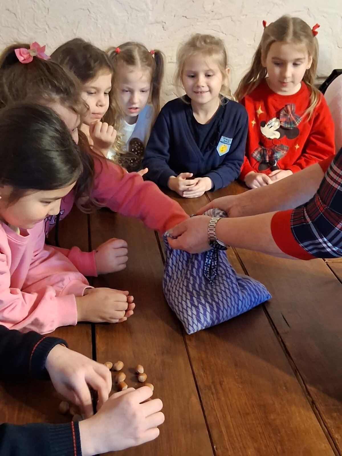 Gruodžio 16 dieną vaikus, lydinčius tėvelius ir mokytojas maloniai sutiko ,,Virbalio vartų" darbuotoja, kuri papasakojo apie tai, ką anksčiau žmonės veikdavo Adventinio laikotarpio metu. Vaikai atsakinėjo į klausimus, minė mįsles, aižė pupas, kedeno vilnas, žaidė lietuvių liaudies žaidimus (,,Siūlai, siūlai, susivykit", ,,Onyte, kur tu?").