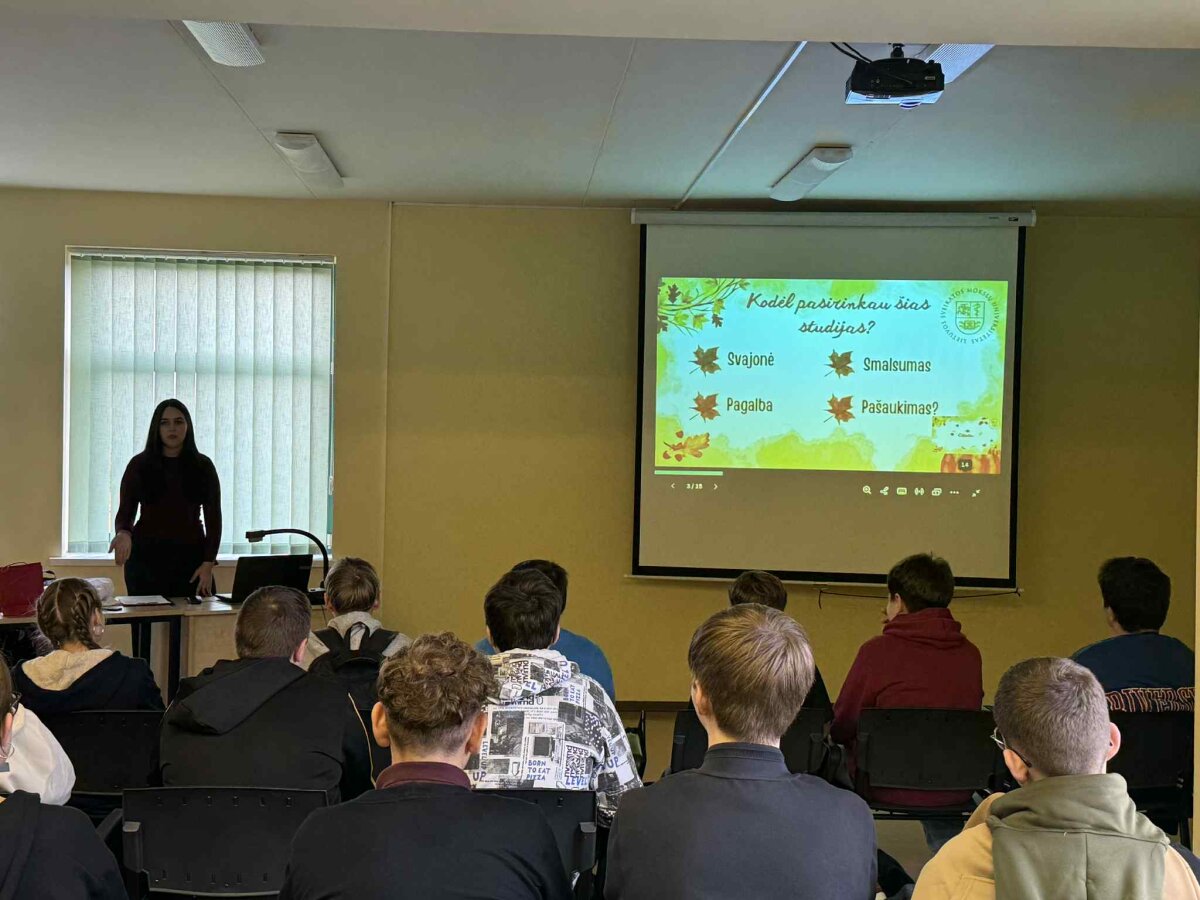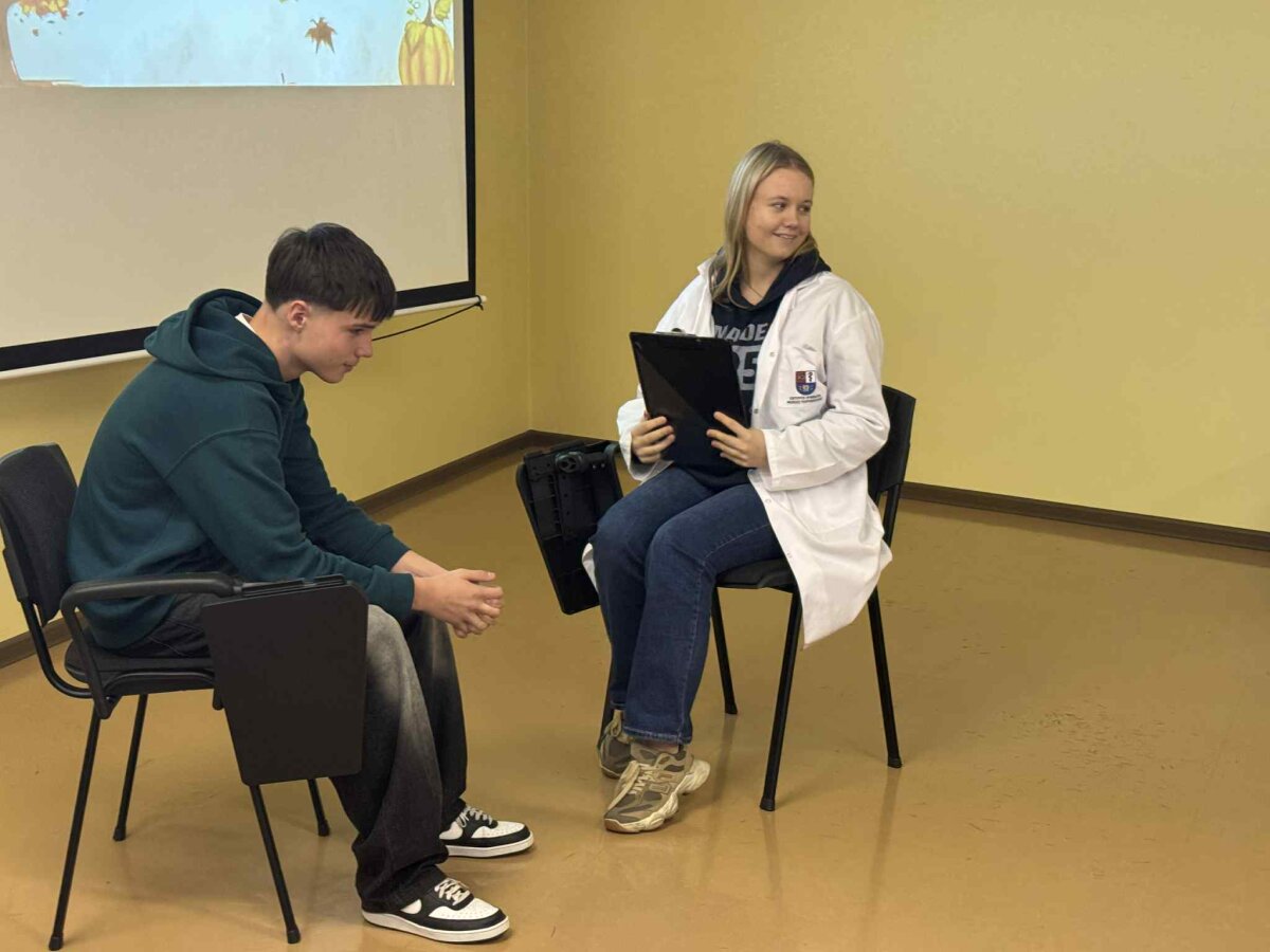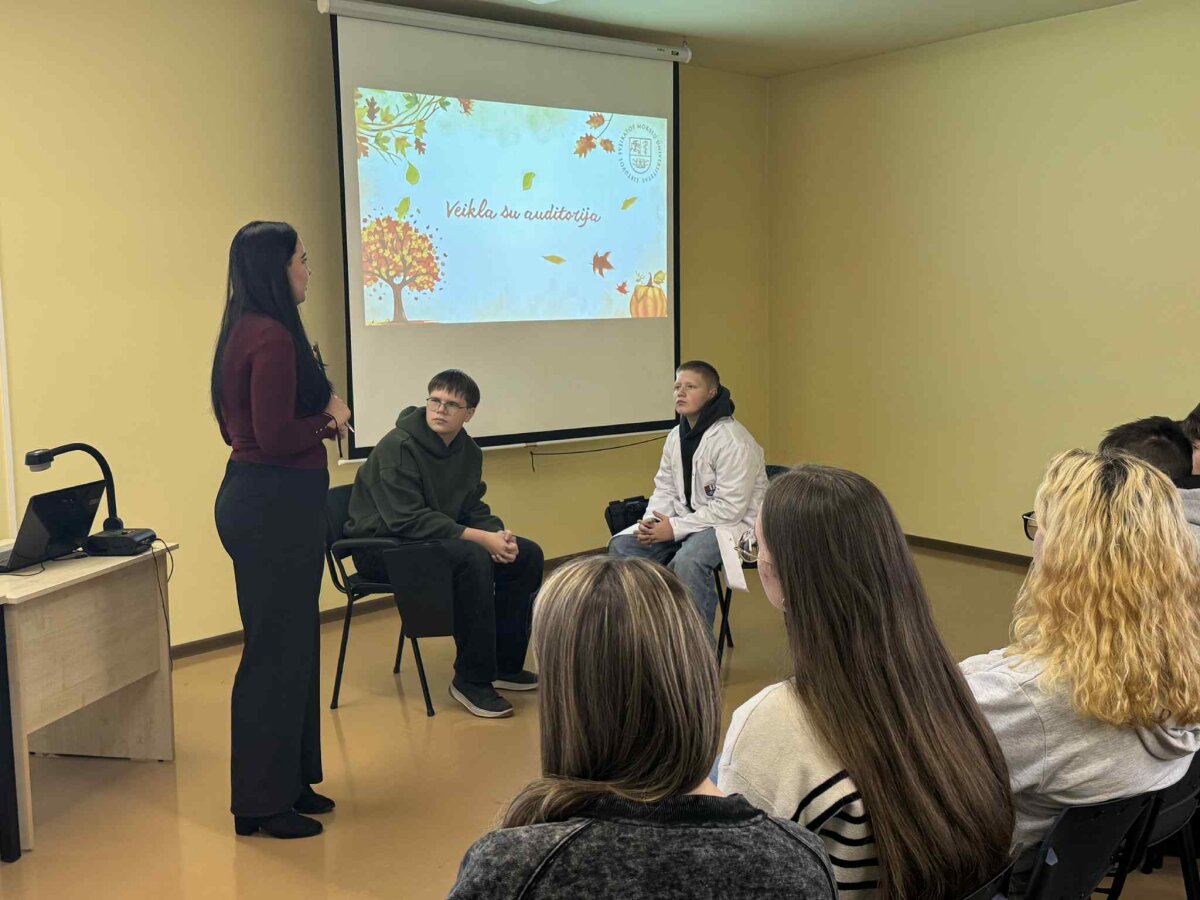 Spalio 17d. buvusi mūsų mokyklos mokinė, Urtė Pangonytė, dabar sveikatos psichologijos antro kurso studentė, grįžo į savo mokyklą, norėdama pasidalinti savo patirtimi ir pristatyti savo profesiją. Ji supažindino mokinius kokius pasirenkamus egzaminus lankė norėdama įstoti, kas lėmė jos pasirinkimą, bei kodėl būtent medicina.